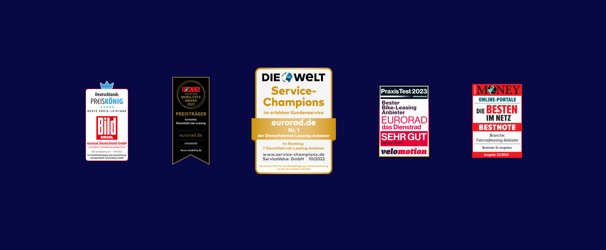 DIE WELT hat in Zusammenarbeit mit Service Value und der Goethe Universität Frankfurt im Rahmen der „Service-Champions 2021“ etwa 4.200 Unternehmen aus allen Branchen unter die Lupe genommen und diejenigen ausgewählt, die bei der Kundschaft besonders positiv abschneiden. Hierbei wurden insgesamt 1,9 Millionen Bewertungen eingeholt und durch ein wissenschaftlich fundiertes Ranking evaluiert. eurorad konnte in dieser Analyse den ersten Platz unter den Dienstfahrrad-Leasing-Angeboten erzielen und erreichte zudem eine herausragende Top-300-Platzierung im Gesamtranking aller Unternehmen. Dafür gab’s Gold für eurorad in der Kategorie Service-Champion. eurorad ist also unter den Playern der Champions-League der Service-Champions.