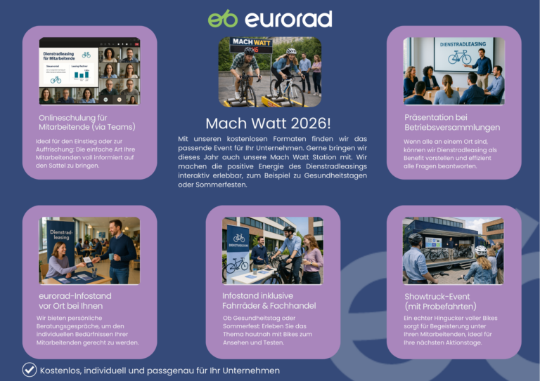 Mit unserem kompakten und praxisnahen Informationsformat bringen Sie Ihre Mitarbeitenden schnell, verständlich und vollständig informiert in den Sattel. Ob erste Berührungspunkte mit dem Dienstrad-Leasing oder gezielte Wissensauffrischung – wir vermitteln alle relevanten Inhalte klar strukturiert, beantworten offene Fragen direkt und schaffen Sicherheit im Prozess. So starten Ihre Teams bestens vorbereitet und motiviert in ihre persönliche Mobilitätslösung.